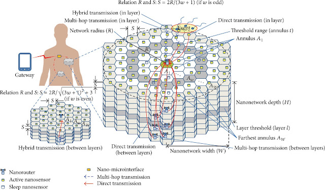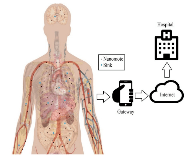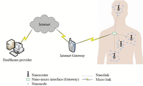 V lidském těle jsou pozorovány nanosenzory a nanoantény, které slouží jako opakování signálů přenášených zvenčí, přes komunikační bránu nebo uzel, tedy mobilní telefon nebo telefonní anténu.