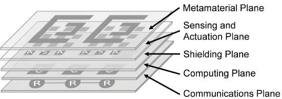 Schéma logické struktury softwarově definovaného metamateriálu, přičemž grafen je metamateriál výslovně citovaný autory (Abadal, S.; Liaskos, C.; Tsioliaridou, A.; Ioannidis, S.; Pitsillides, A.; Solé-Pareta , J .; Cabellos-Aparicio, A. 2017)