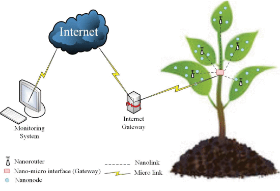 Ve skutečnosti velká paralelnost mezi sítěmi v lidském těle a v rostlinách není náhodná. Slovy (Balghusoon, AO; Mahfoudh, S. 2020) IoNT v biomedicínské a zemědělské oblasti se skládá ze stejných prvků, a to „ nanod, nanorouterů, nanorozhraní a internetové brány “. Vzhledem k zájmu o jeho definici jsou uvedeny v následujícím seznamu: