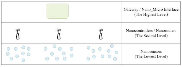 Komponenty nanokomunikační sítě na třech úrovních.