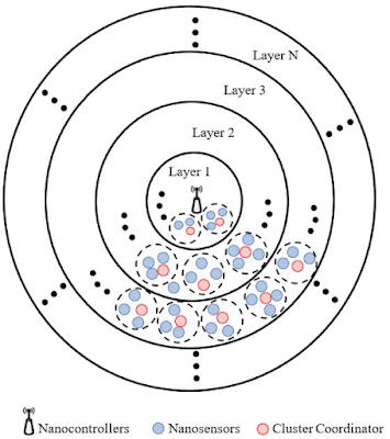 Všimněte si organizace nanosenzorů prostřednictvím shluků, ve kterých jsou informace přenášeny prostřednictvím koordinačního uzlu, který dosahuje blízkostí koordinátora nejbližší skupiny, dokud nedosáhne nanorouteru / nanokontroléru, který přenáší informace mimo tělo.