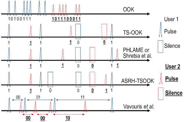 Porovnání mezi různými pulzními signály, mezi nimiž je TS-OOK a další deriváty.