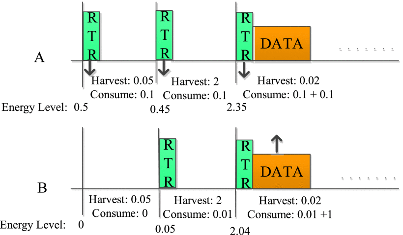 Schéma výměny datových paketů, RTR hlavičky (připravené k příjmu) a jejich optimalizovaná spotřeba energie.