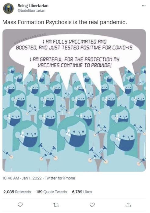 Lidé jsou historicky kolektivně pravidelně dováděni k šílenství chamtivostí, hněvem nebo strachem, takže Twitter, Reuters a Associated Press dnes znovu zběsile šíří dezinformace ve svém urputném pokusu zdiskreditovat vysoce důvěryhodného Roberta Malonea a Joea Rogana, kteří přitom pouze jen ovlivňují masy lidí zpět ke znovunabytí smyslů. Stádo se za poslední dva roky sice úplně zbláznilo, ale s takovými vypravěči pravdy, jako je Malone, Rogan a stovky dalších inteligentních vlasteneckých Američanů, bude tento velký covidový podvod, kterého se na světě dnes dopouštějí mocní a zlí muži, již brzy odhalen a poražen.