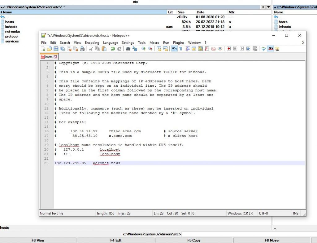 V některých případech nejde upravovat soubor hosts v adresáři \etc\ přímo a musíte soubor nejprve zkopírovat jinam, třeba do složky Dokumenty, tam provedete úpravu souboru a potom zpátky soubor překopírujete do složky \etc\ a potvrdíte přepis původního souboru s právy administrátora. Hotovo, šmitec. Od tohoto okamžiku můžete přistupovat na server i v případě, že by někdo z operátorů vám přestal na svých DNS překládat webovou adresu .news našeho webu. Preventivně, pro všechny případy, strýčka Příhodu a podobné exoty, náš administrátor doporučuje si tuto úpravu udělat preventivně teď a hned, abyste byli připraveni. Jak říká admin, tohle řešení je geniální v tom, že je úplně zadarmo!