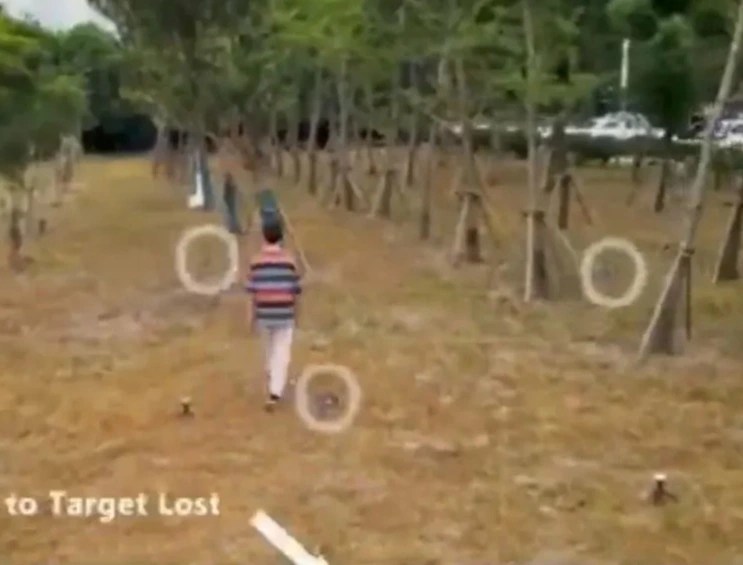 Ale v mrazivém obratu událostí posádka na Zhejiang University také vyzkoušela tyto své inteligentní autonomní drony na muži, který se prodíral shlukem stromů.