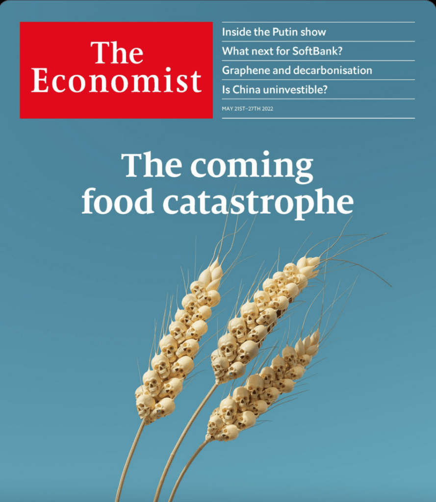 Pak je tu ta dost strašidelná obálka časopisu Economist Magazine . Toto je publikace zcela vlastněná Rothschildy, která vysloveně vychází vstříc elitním globalistům. Zobrazuje pšeničné pole s pšeničnými zrny znázorněnými jako lidské lebky s názvem „Přicházející potravinová katastrofa“.
