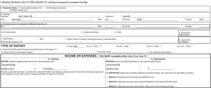 V průběhu let 2021 a 2022 si Ant Group v USA najala čtyři externí lobbistické a public affairs firmy, aby jí pomohly s jejími cíli, včetně „zvýšení dosahu obchodních operací a firemního profilu společnosti Ant Group a její dceřiné společnosti Alipay US“.