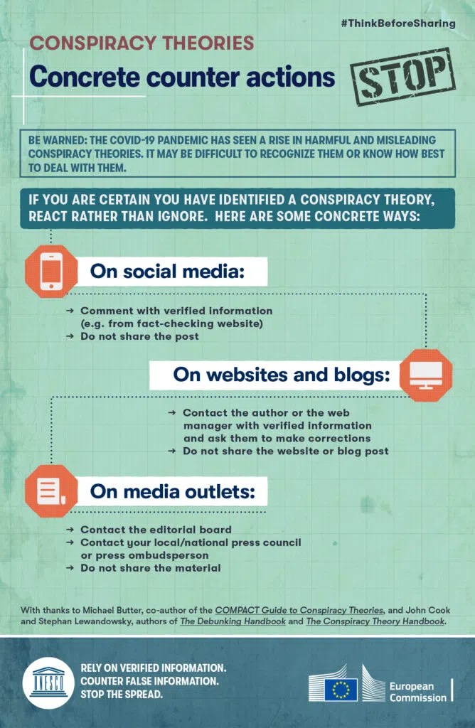 Podle UNESCO právě proto „ pokud jste si jisti, že jste se setkali s konspirační teorií “ na internetu, musíte „ reagovat “ což znamená umístit relevantní odkaz na „ webovou stránku pro ověřování faktů v komentářích