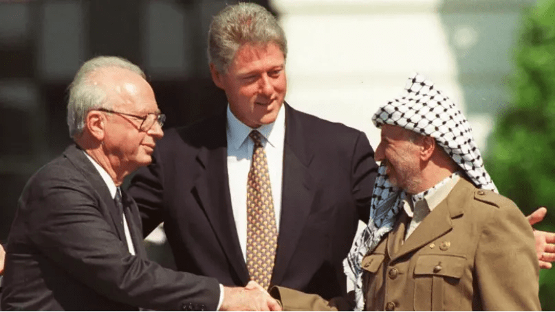 Jicchak Rabin (vlevo) si potřásá rukou s Jásirem Arafatem (vpravo), zatímco Bill Clinton (uprostřed) se na to dívá