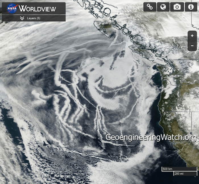 Ve skutečnosti NASA není nic jiného než dodavatel vojenského průmyslového komplexu pro mocenskou strukturu, klamání veřejnosti bylo vždy hlavní součástí poslání této agentury. Podívejme se na oficiální stanovisko NASA ke geoinženýrství (neboli „chemtrails“), NASA, NOAA, NWS a USAF nám říkají, že neúnavné bombardování atmosférickým rozprašováním částic na naší obloze je všechno jen „kondenzační stopy“ . Je toto vysvětlení nějakým způsobem věrohodné? Pokud se vezmou v úvahu konstrukční charakteristiky moderního proudového motoru s turbodmychadlem s vysokým obtokem , tak oficiální narativ NASA že jsou to „jen kondenzáty“ může být viděn takový, jaký skutečně je,totiž že je to totální podvod. Níže je smyčka satelitní animace, která jasně odhaluje četné extrémně dlouhé kondenzačnií stopy (některé dlouhé přes 500 mil) pokrývající velkou část východního Pacifiku u západního pobřeží Severní Ameriky.