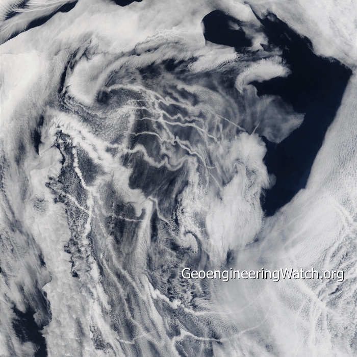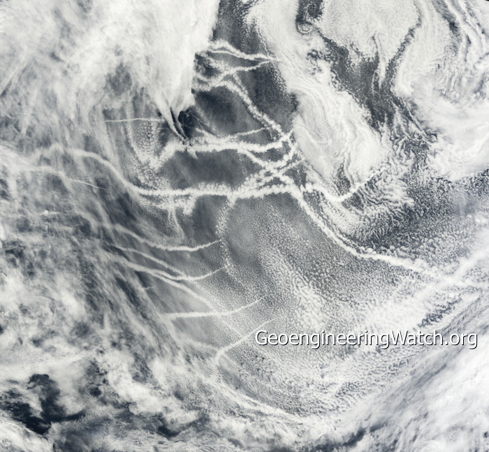 Je racionální plně přijmout vysvětlení „stopy lodí“ od NASA jako JEDINÝ zdroj stop, které tak jasně vidíme na následujících obrázcích? NASA samozřejmě žádným způsobem neuznává pokračující geoinženýrství / řízení slunečního záření rozptylování proudových letadel . Musíme vzít v úvahu a pamatovat si, že jakýkoli způsob dodávání toxických částic do atmosféry (desperze lodí nebo tryskových letadel) jsou formy klimatického inženýrství / zásahů, které způsobují nesmírné škody na celkovém systému podpory života na planetě.