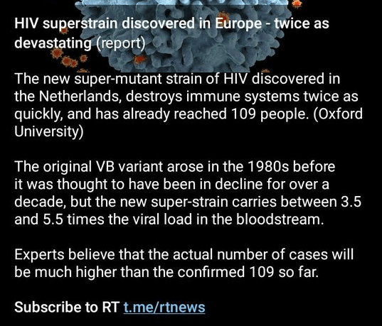 V poslední době vědci rovněž identifikovali novou variantu VB-HIV, která je mnohem více virulentnější a může proto zničit imunitní systém lidí mnohem rychleji než to dokázal ten původní kmen HIV. Vědci také tvrdí, že ti, kteří se infikovali Covidem, jsou také mnohem náchylnější k infekci HIV. Není pochyb o tom, že když tito vědci NWO použijí tato svá data, tak jejich „nový příběh“ bude ten, že ti, kteří se infikovali Covidem, jsou nyní také nositeli této nové varianty VB-HIV! Ano, nepolapitelná VB-Varianta, která se nyní rozhodne znovu se objevit během naší pandemie Covid po 40 letech… a budou z toho obviňováni ti nevakcinovaní! Vidíte … vždy to bylo schováno uvnitř vakcíny a nyní ti „posílení vakcínou“ sami produkují právě tuto „variantu VB-HIV“ a dělali to celou dobu! Nazvěme to tedy tím, čím to ve skutečnosti také je: „Variantou HIV posílenou právě vakcínou“!