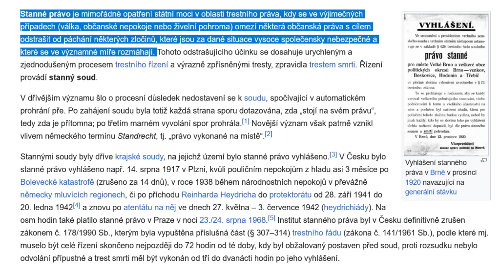 Takže jak vydíte na Wikipedii výše, tak tzv.“stanné právo“ není jen něco, co se může stát tak v USA, nebo někde ve Venezuele či v Africe, ale že se to může reálně stát, a také se to již skutečně stalo, i tady u nás v české kotlince. Institut stanného práva byl sice v česku zrušen zákonem, ovšem vzhledem k aktivitám naší fašistické vlády, jako je třeba ono nenápadné (mainstream o tom rozhodně nemluví) zato však významné posilování pravomocí vojenské policie, tak si lze snadno představit i to, že se něco takového, jako bylo kdysi stanné právo, opět nenápadně znovu objeví. Za naprostého nezájmu ovčánků pochopitelně. Představme si tuto situaci konflikt na Ukrajině se zhorší a NATO tam vlítne, v Polsku, na Slovensku, v Maďarsku a u nás se vyhlásí mobilizace, národu ten průser konečně dojde a rozhoří se občanské nepokoje, bude přibývat ozbrojených střetů mezi skupinami občanů a vojenskou policií a do toho sem Rusové pošlou tři rakety a zbourají celou Vltavskou kaskádu. A v tu chvíli bude na výzvu fialenkovi podpindosnické vlády vyhlášen nouzový stav a za další chvíli bude vyhlášeno stanné právo, které jako jediné naší armádě umožní obnovit zákon a pořádek, protože situace a sociální krize se stanou nezvladatelné. Použije se tak pouze jako jakási poslední možnost k záchraně současného vládního systému na pokraji totálního kolapsu. A že to zní příliš apokalypticky? Inu, nemyslím si to, vše co naše současná vláda naprostých psychopatů dělá a neděla, tak k tomutu, či velmi podobnému scénáři bohužel spěje
