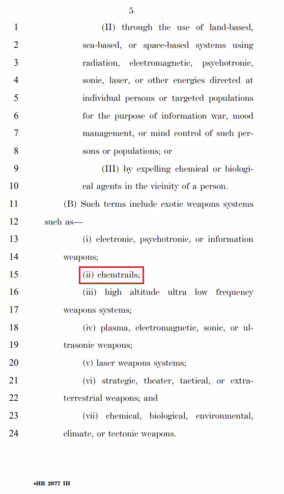 Na dalším slyšení, v roce 2001 během 107. zasedání kongresu, usnesení sněmovny č. 2977 byla předložena rezoluce známá jako „Zákon o ochraně vesmíru z roku 2001.“ Účelem této rezoluce bylo zachovat kooperativní, mírové využívání vesmíru ve prospěch celého lidstva s trvalým zákazem umisťování zbraní ve vesmíru Spojenými státy a požadavkem, aby prezident USA podnikl kroky k přijetí a implementaci světové smlouvy o trvalém zákazu vesmírných zbraní. Na 5. straně tohoto dokumentu, oddíl (2) (B) (ii) se můžeme dočíst o využívání „chemtrails„„ kdy jsou zde chemtrails zcela otevřeně uvedeny jako známá zbraň aplikovaná do vzdušného prostoru USA: