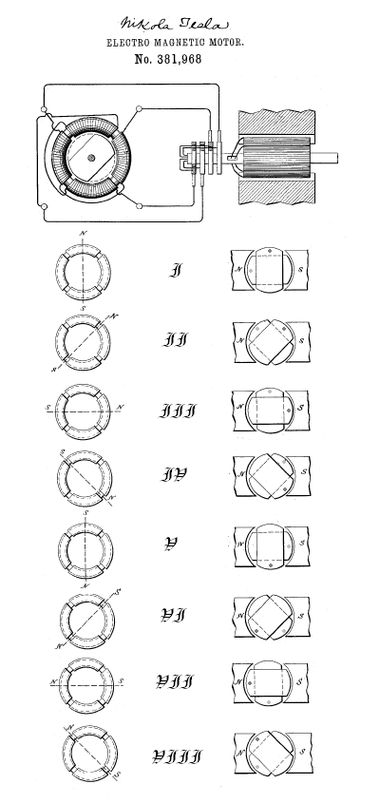 Výkresy z US patentu 381,968, ilustrující princip Teslova indukčního motoru na střídavý proud.