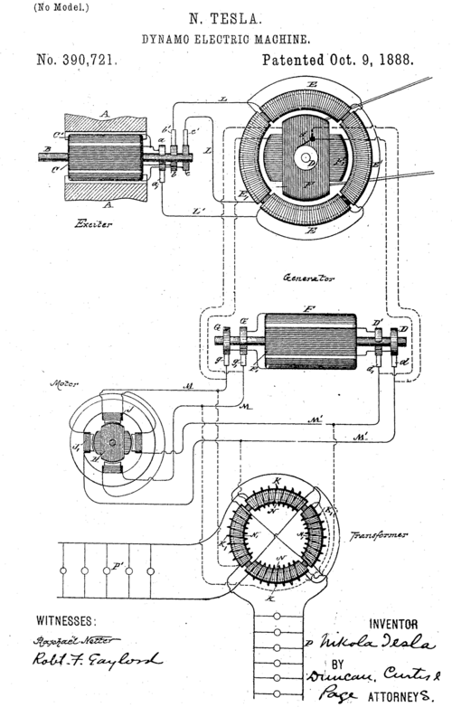 Teslův AC dynamoelektrický stroj (AC elektrický generátor) z roku 1888 US patent 390,721