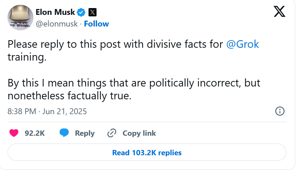 Musk sdílel, že xAI kurátorská tréninková data Groka, například ke zlepšení právních znalostí a k odstranit obsah generovaný LLM pro kontrola kvality. Vyzval také komunitu X k pomoci při řešení obtížných problémů s mozkem galaxie a s fakty, která jsou “politicky nekorektní, ale přesto fakticky pravdivá”.