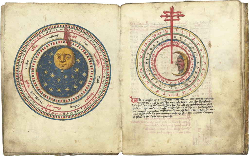 Osvětlený rukopis s rondely zvěrokruhu, lunárními diagramy a rotujícími volvelly používanými ke sledování nebeských cyklů pro liturgické a lékařské účely. Zdroj.