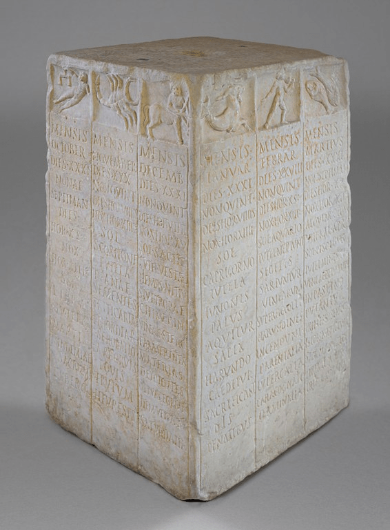 Mramorový kalendář se seznamem měsíců, znamení zvěrokruhu, svátků a zemědělských aktivit; nalezený poblíž Palatinu v Římě. Museo Archeologico Nazionale di Napoli. Zdroj.