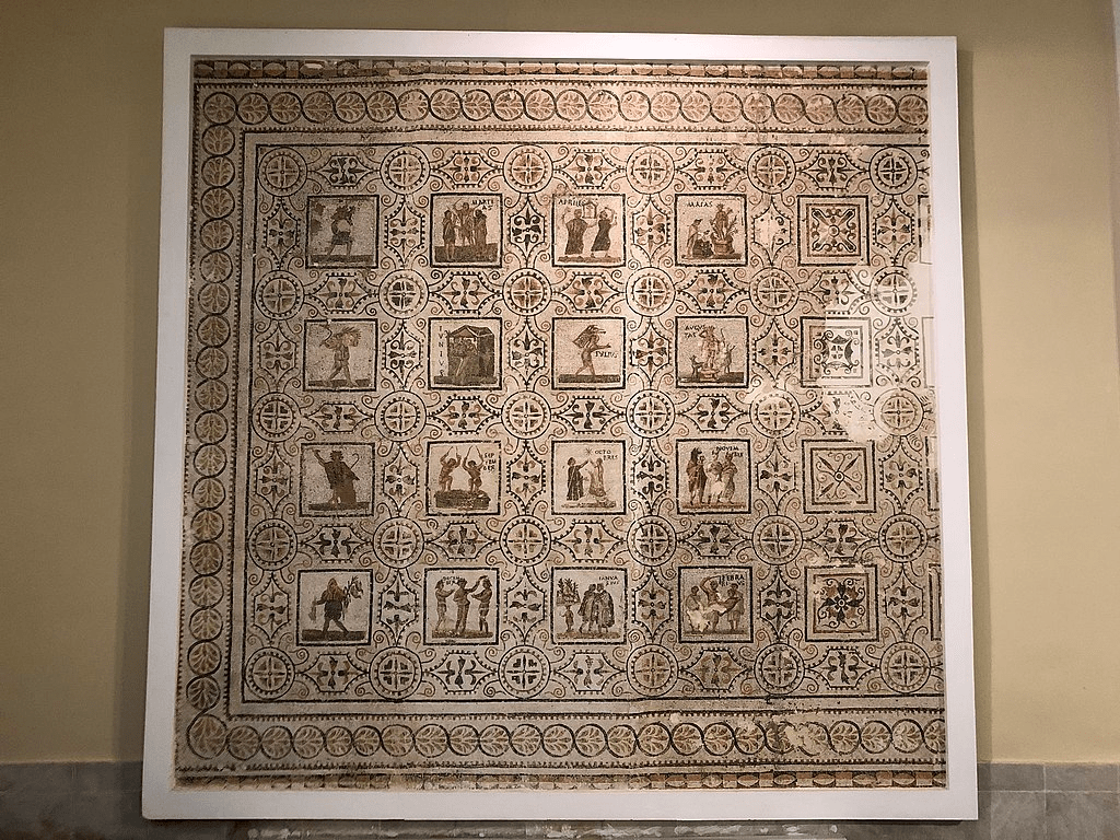 Podlahová mozaika zobrazující roční cyklus prostřednictvím personifikovaných měsíců a sezónních prací; Archeologické muzeum v Sousse. Fotografie Yamen, 2021. Zdroj.
