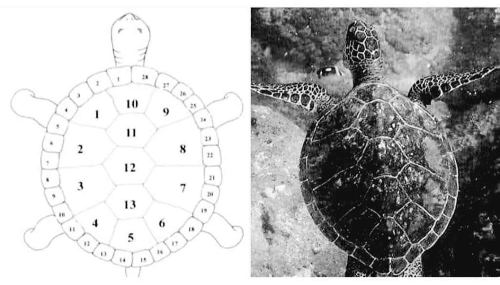 Uspořádání skořápkových štítků bylo v některých domorodých tradicích spojeno s lunárními cykly a sezónním měřením času. Zdroj.