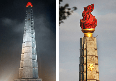 Hlavní město země, Pchjongjang, má vlastní Sochu svobody (i když nazvat to tak v zemi, jako je Korea, by byl už trochu černý humor). Čučche, tvé jméno je to, co se zde nazývá ideologie země. Je to ta stejná pochodeň jakou drží i Mithra z New Yorku, ale její základem zde není dáma, ale obelisk, velký to symbol Anunnaki.
