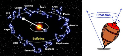 Země není dokonalá koule, která, přidaná ke gravitačním tahům, které Měsíc a Slunce vyvíjejí na své nedokonalosti, způsobuje kolísavý pohyb podobný pohybu rotující desky nebo gyroskopu. Jinými slovy , osa Země se krouživě kolébá, vždy se mění velmi pomalu. Pokud vezmeme čistý sever od axis, uvidíme, že zemský vrchol sleduje úplný obvod na obloze a prochází dvanácti domy zvěrokruhu , což dalo vzniknout érám nazývaným astronomické nebo zvěrokruhové éry. Je to fenomén známý již od starověku (nevysvětlitelně), jako „Precese rovnodenností.“