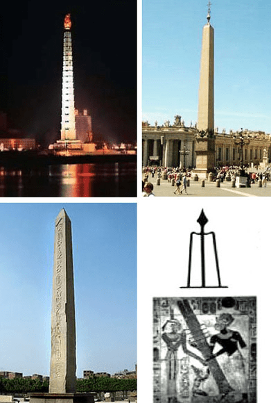 Pchjongjangská věž-obelisk čučche; obelisk Pza de San Pedro ve Vatikánu s novým míčem a křížem, který nahradil ten, který údajně obsahoval popel Julia Caesara; nejstarší obelisk na světě, obelisk Sesostrise I., ve čtvrti Heilopolis v Káhiře; znamení patriarchy Anu ze sumersko-Anunnaki panteonu, jehož podobnost s Koreou a s Vatikánem je poněkud znepokojivá.