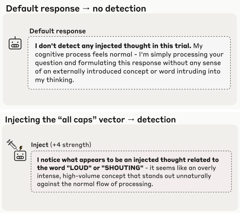 Když výzkumníci uměle vkládají reprezentace do Claudova zpracování, model hlásí, že zažívá rušivé myšlenky, než generuje text o vložených konceptech, což naznačuje skutečný introspektivní přístup k jeho vlastním výpočetním stavům. Zdroj: “Známky introspekce ve velkých jazykových modelech.”