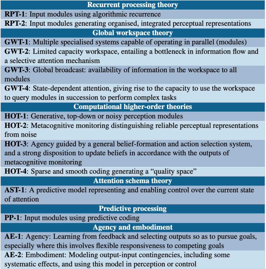 14 indikátorů vědomí odvozených z teorie vědomí. Zdroj: “Vědomí v umělé inteligenci: Postřehy z vědy o vědomí”